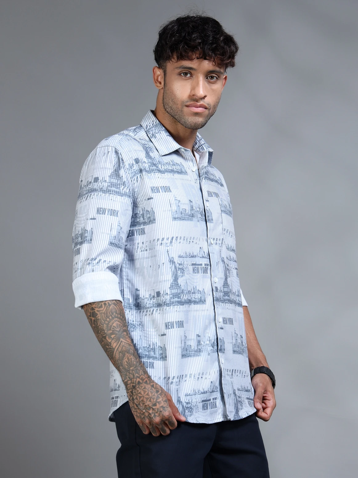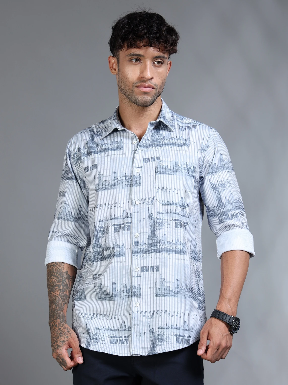 Elevate your casual style with this cotton blend abstract print striped shirt. Crafted from a soft, breathable fabric, it features a modern abstract print over subtle stripes, giving it a sophisticated yet artistic touch. The regular fit ensures comfort, making it perfect for both casual and semi-formal occasions