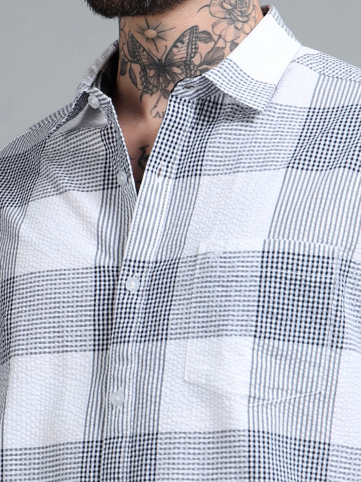 Redefine subtle sophistication with this cotton textured mini checks shirt. Crafted from premium breathable cotton, it features a fine checkered pattern with a soft textured finish for a refined yet casual look. Its full sleeves, spread collar, and regular fit make it a timeless piece that transitions seamlessly from work to weekends