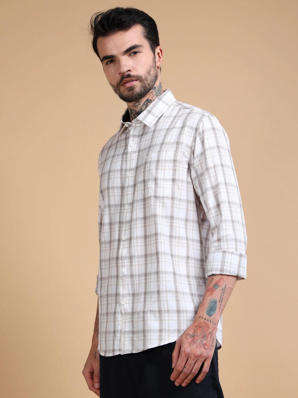 Upgrade your wardrobe with this dobby cotton checked shirt, crafted for both comfort and refined style. Made from soft, breathable cotton fabric, it features a subtle dobby weave that adds texture and depth to the classic check pattern. Designed in a regular fit with full sleeves, this shirt brings together timeless design and everyday versatility