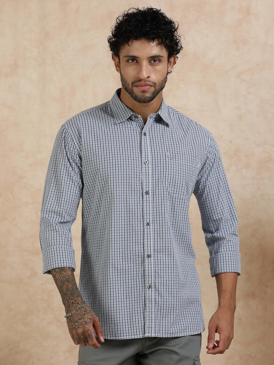 Men's Micro Poplin Checks Full-Sleeve Shirt with Spread Collar