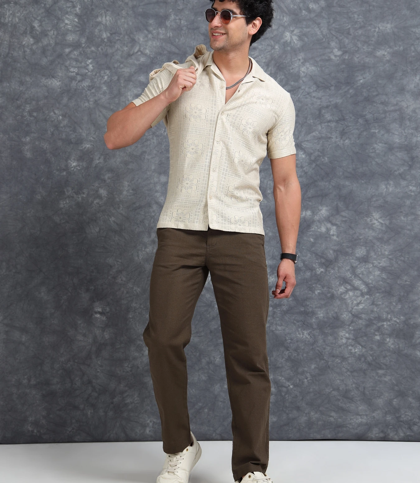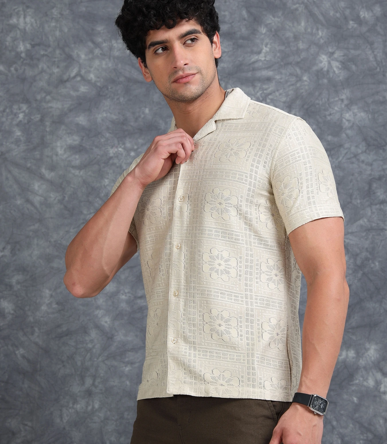 Step up your fashion game with this Self Design Sheer Straight Fit Half Sleeves Shirt, made from a lightweight textured sheer fabric. The straight fit provides a clean, relaxed drape, while the subtle self-design patterns add depth and sophistication. Perfect for stylish summer looks, parties, or effortless evening wear