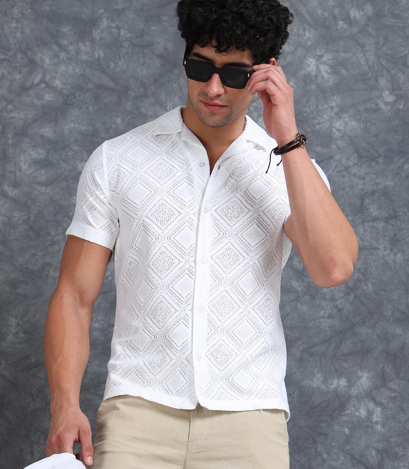 Step up your fashion game with this Self Design Sheer Straight Fit Half Sleeves Shirt, made from a lightweight textured sheer fabric. The straight fit provides a clean, relaxed drape, while the subtle self-design patterns add depth and sophistication. Perfect for stylish summer looks, parties, or effortless evening wear