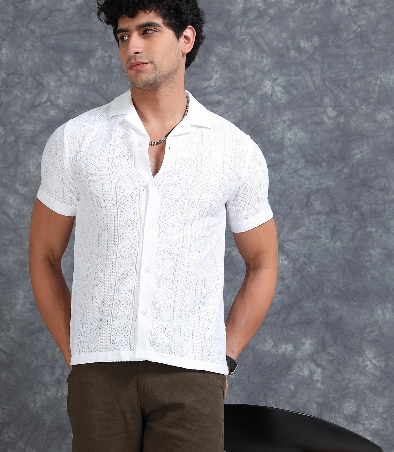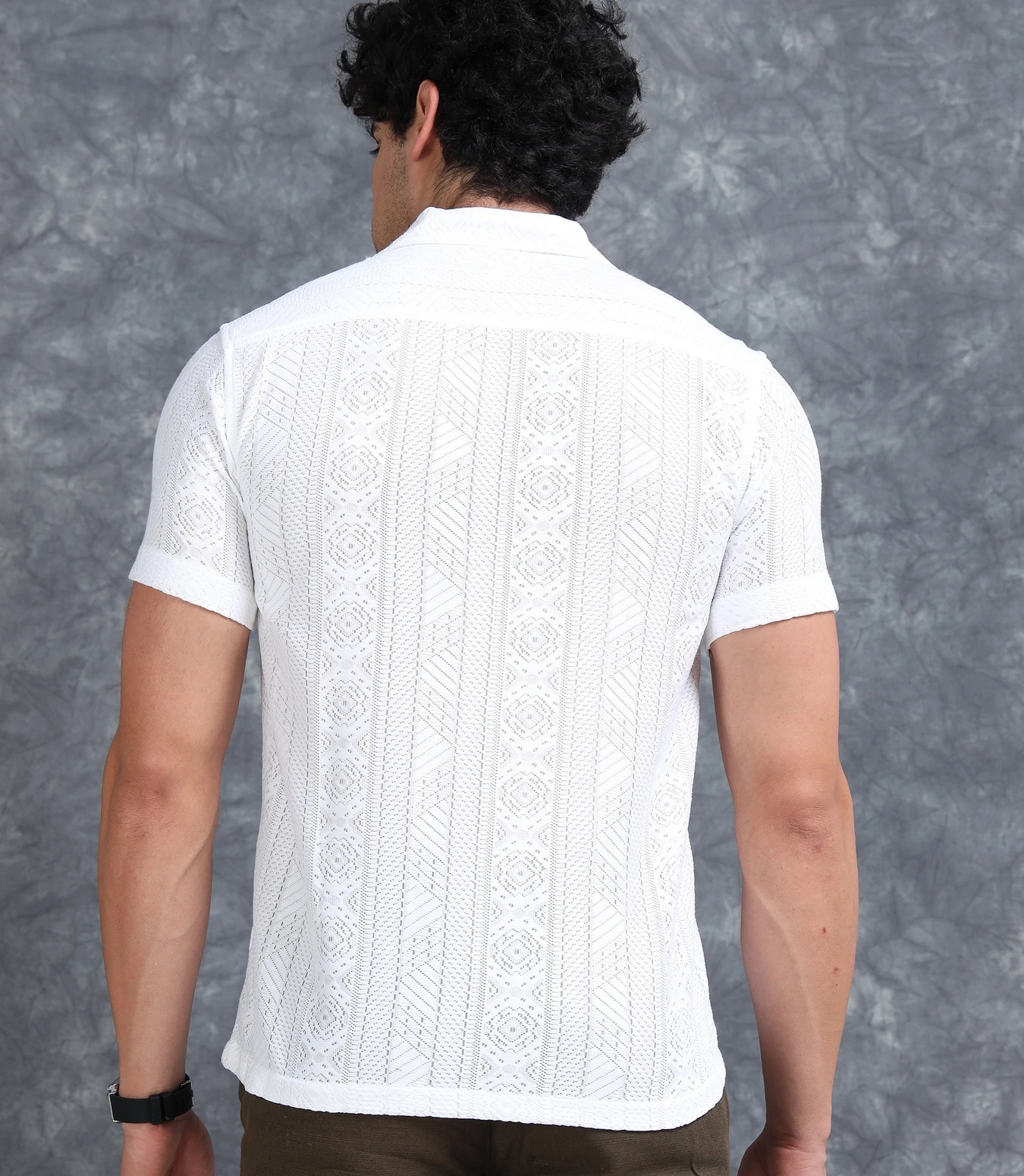 Step up your fashion game with this Self Design Sheer Straight Fit Half Sleeves Shirt, made from a lightweight textured sheer fabric. The straight fit provides a clean, relaxed drape, while the subtle self-design patterns add depth and sophistication. Perfect for stylish summer looks, parties, or effortless evening wear