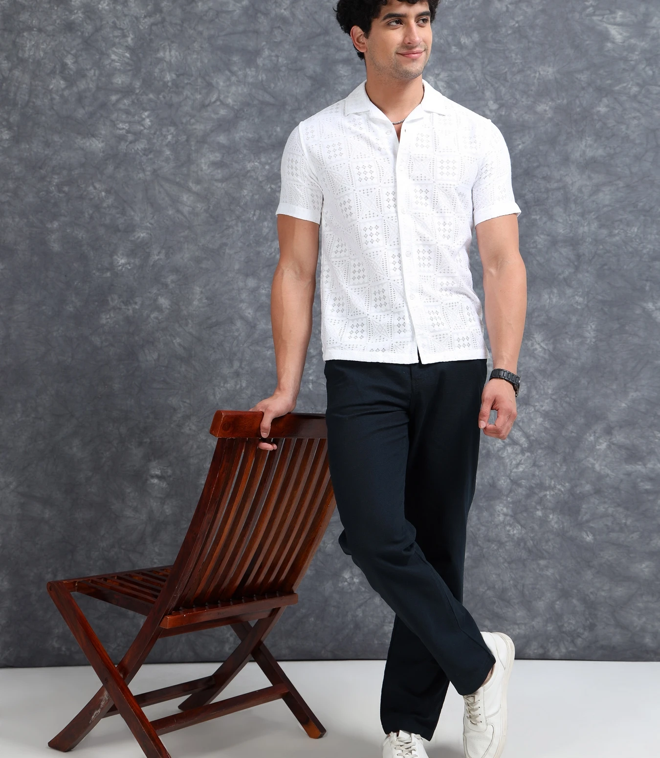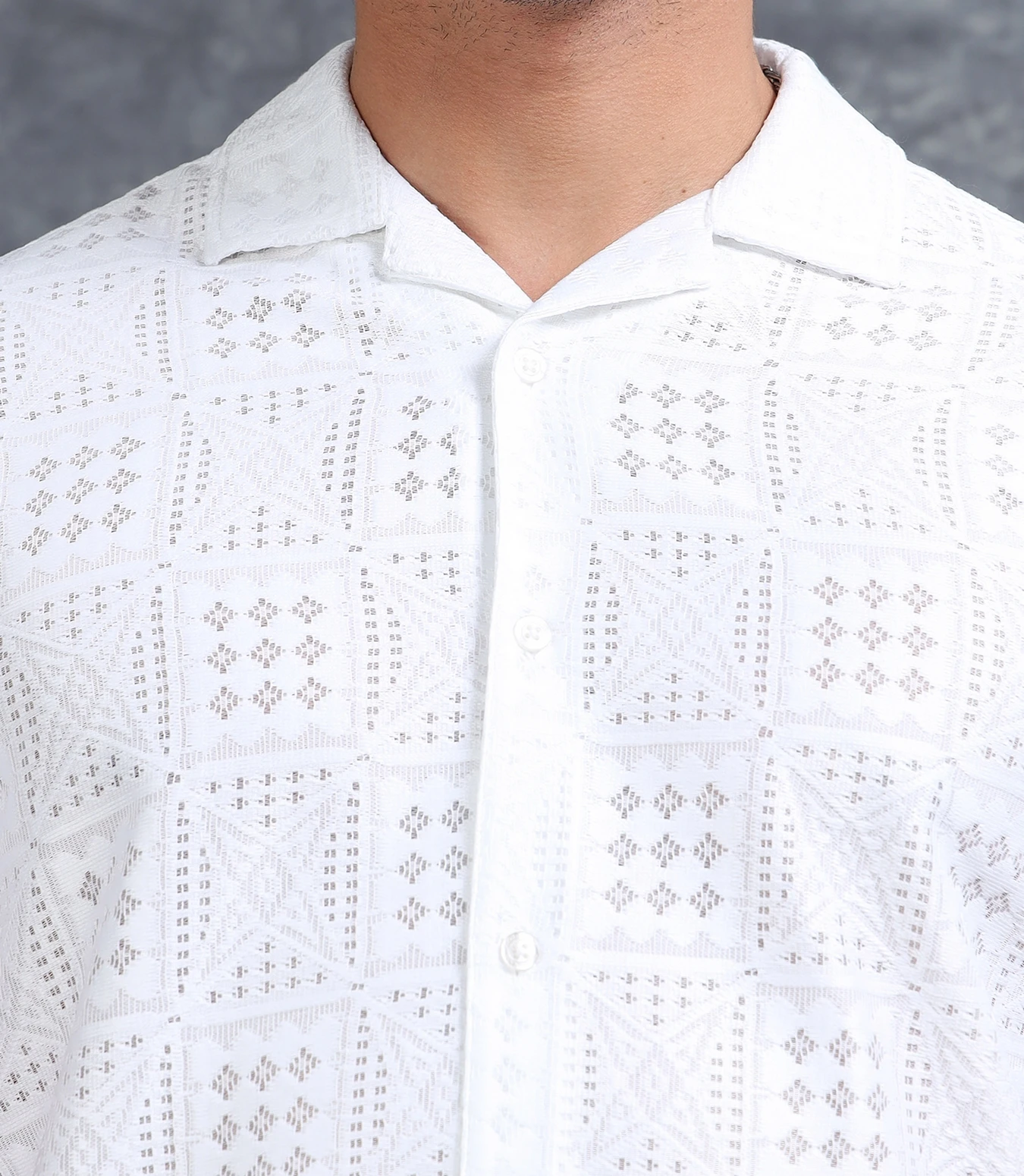 Step up your fashion game with this Self Design Sheer Straight Fit Half Sleeves Shirt, made from a lightweight textured sheer fabric. The straight fit provides a clean, relaxed drape, while the subtle self-design patterns add depth and sophistication. Perfect for stylish summer looks, parties, or effortless evening wear