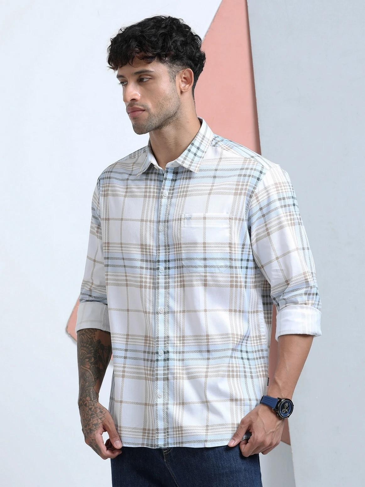 A modern twist on a classic, this cotton lycra checks shirt combines timeless patterns with stretchable comfort. The cotton base ensures breathability, while a hint of lycra offers flexibility for all-day ease. Perfect for smart-casual dressing